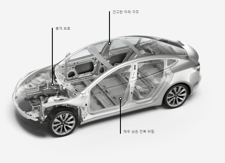 테슬라 모델3는 알루미늄과 강철을 합친 튼튼한 구조의 골격을 갖추어 구조적 안정성을 확보했습니다. 또한 배터리